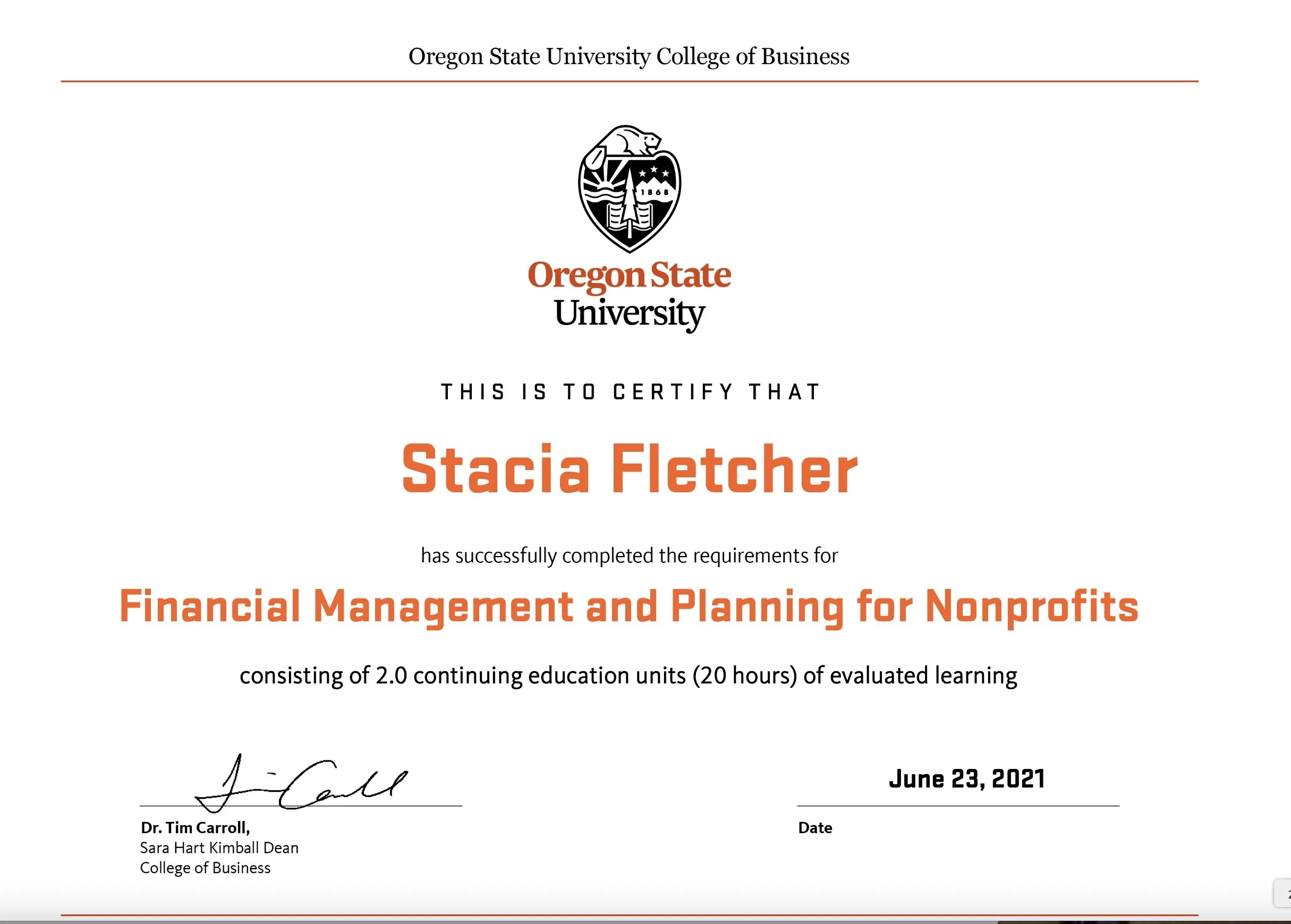 I have attended the Grantsmanship Center’s Essential Grant Skills Course and have also taken the Financial Management and Planning for Nonprofits course offered by Oregon State University’s College of Business.